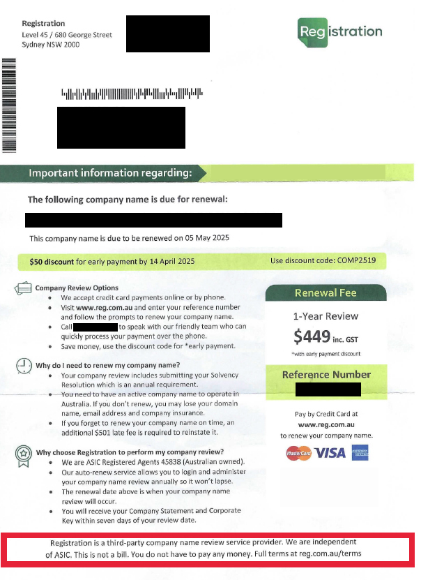 fraudsters impersonate the Australian Securities and Investments Commission (ASIC), or other registration companies, asking individuals and
